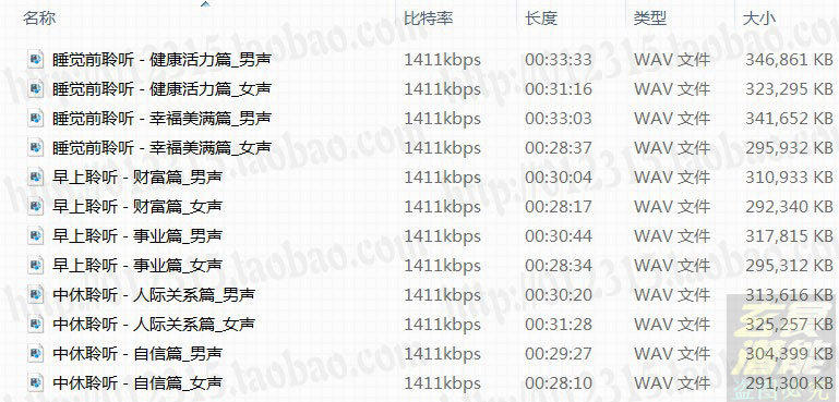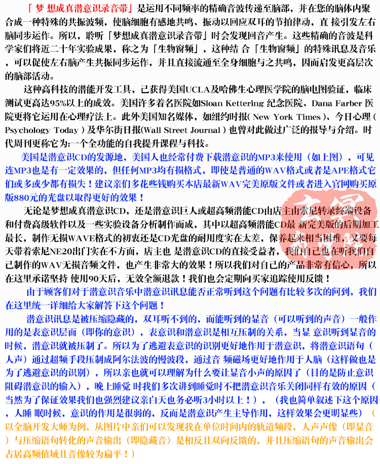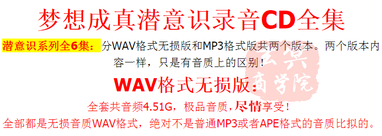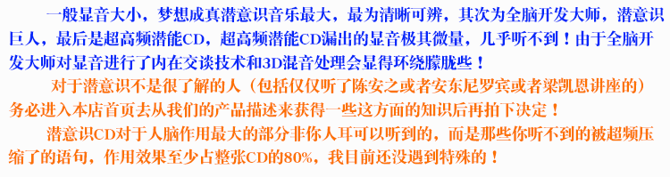 正能量梦想成真潜意识CD全套无损音质 增加财富健康自信能量音乐疗法 分类栏目:潜能催眠 主讲导师:潜意识CD 音频集数:12CD 资源来源:网友上传 收听人数 +点我分享 赞[] 评论[] 收藏 手机听听 音频介绍 播放列表 下载音频 1睡觉前聆听 - 健康活力篇_男声 2睡觉前聆听 - 健康活力篇_女声 3睡觉前聆听 - 幸福美满篇_男声 4睡觉前聆听 - 幸福美满篇_女声 5早上聆听 - 财富篇_男声 6早上聆听 - 财富篇_女声 7早上聆听 - 事业篇_男声 8早上聆听 - 事业篇_女声 9中休聆听 - 人际关系篇_男声 10中休聆听 - 人际关系篇_女声 11中休聆听 - 自信篇_男声 12中休聆听 - 自信篇_女声 点我下载配套学习文档 喜欢 ( )